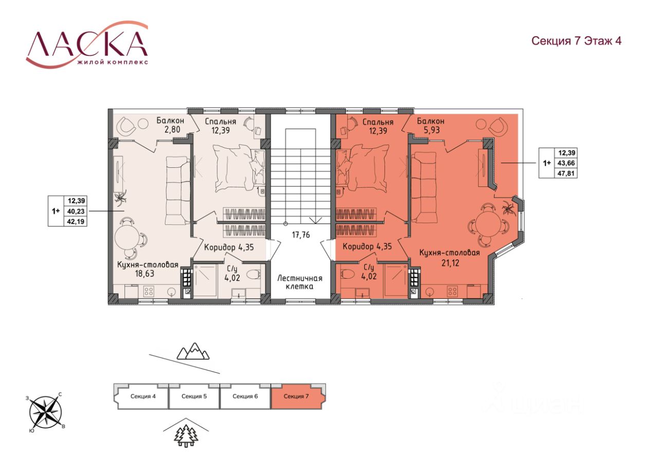 На каждом этаже всего 2 квартиры, что обеспечивает приватность.
