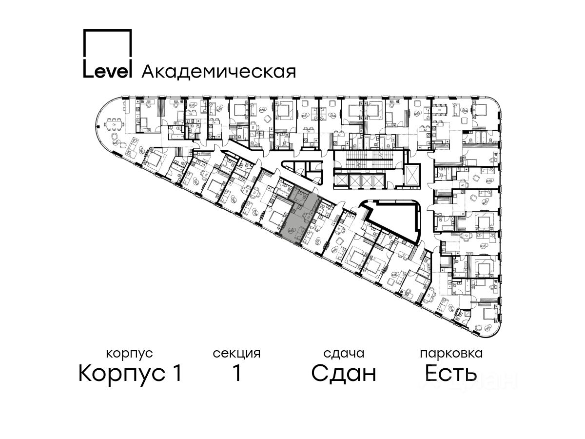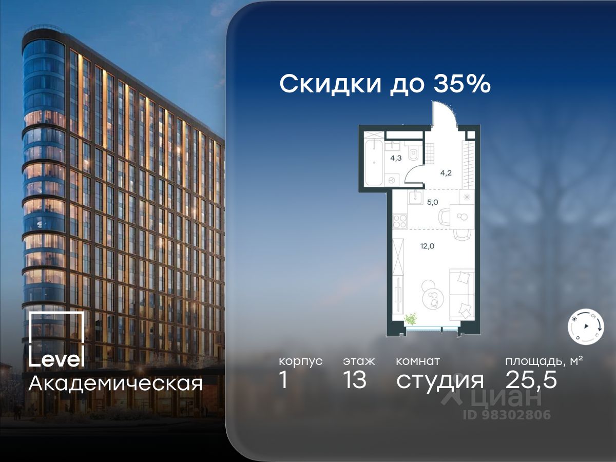 В Академическом районе продаётся квартира-студия площадью 25.50 кв.м без отделки. Квартира расположена на 13-м этаже 19-этажного жилого комплекса бизнес-класса Левел Академическая (компания Левел Group).