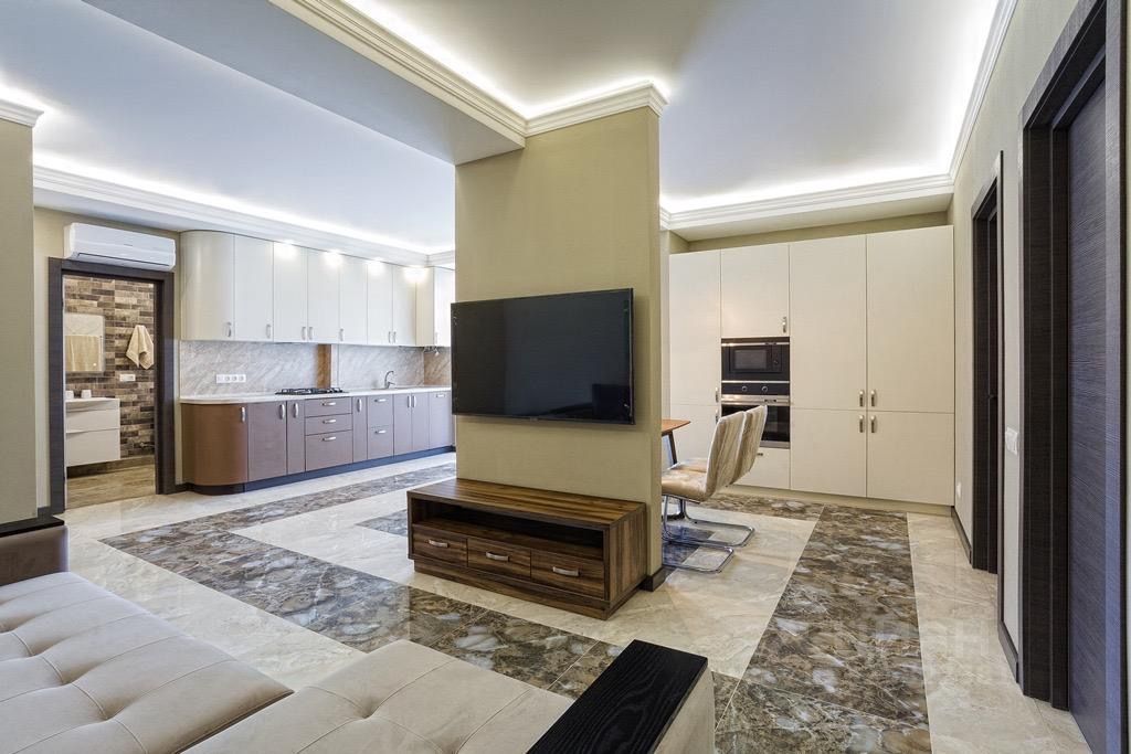 Кухня: Современная кухонная мебель, встроенная техника (холодильник, плита, вытяжка).