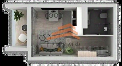 Студия общей площадью 27,39 м2 ,с видом на море и горы, в том числе: 20,48 м2 кухня-гостиная, 3,03 м2 совмещенный санузел, 3,88 м2 лоджия.