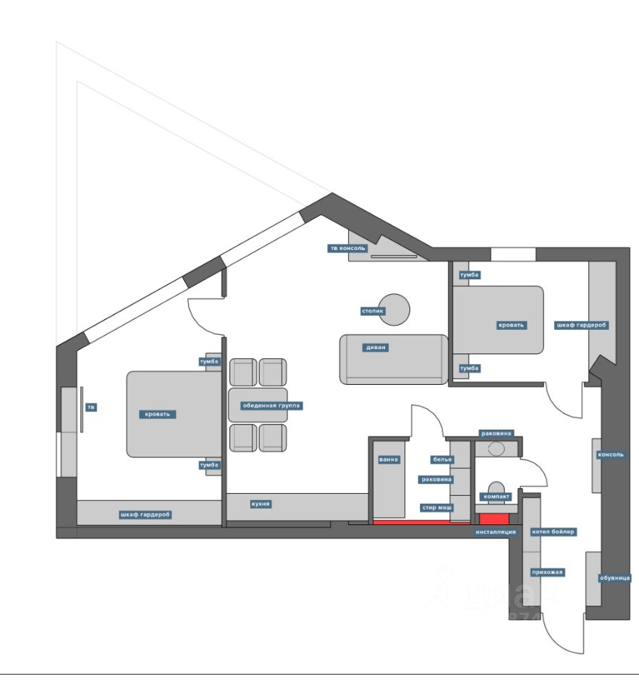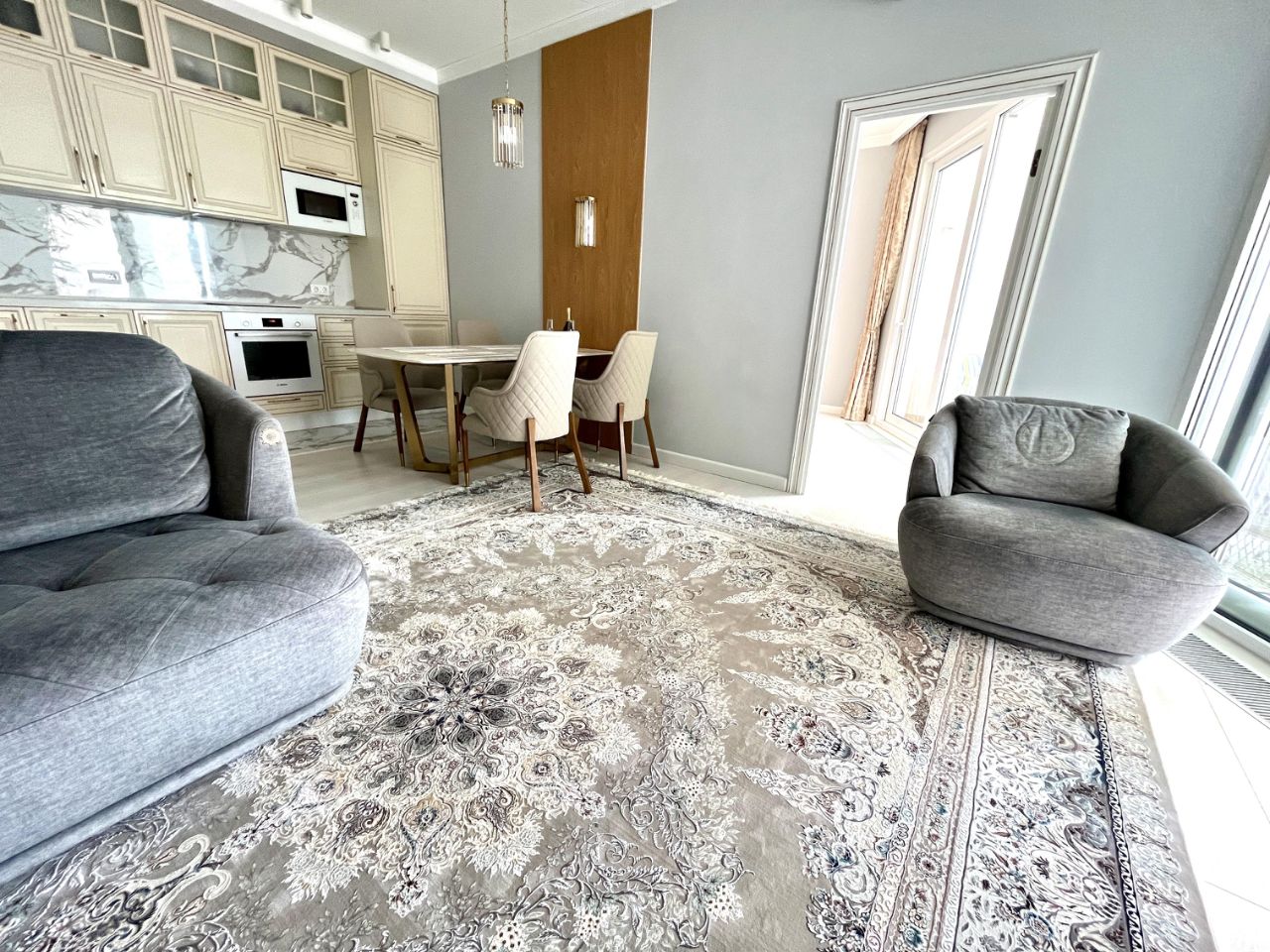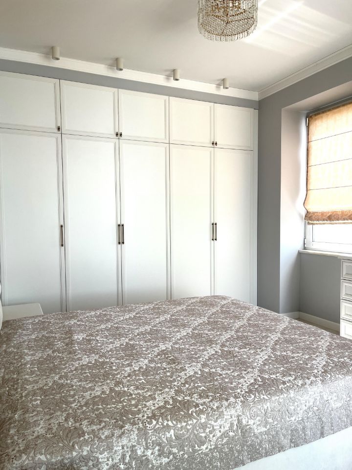 Планировка квартиры: просторная терраса 18кв.м, кухня- гостиная и две изолированные спальни, раздельные санузлы.
