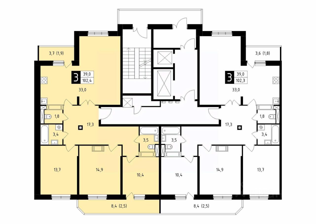 Продаётся 3-комнатная квартира в сданном доме (Корпус 43), срок сдачи: 4-кв. 2025, общей площадью 102.40 кв.м., на 17 этаже.