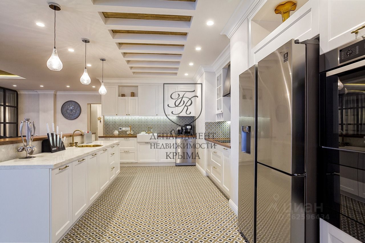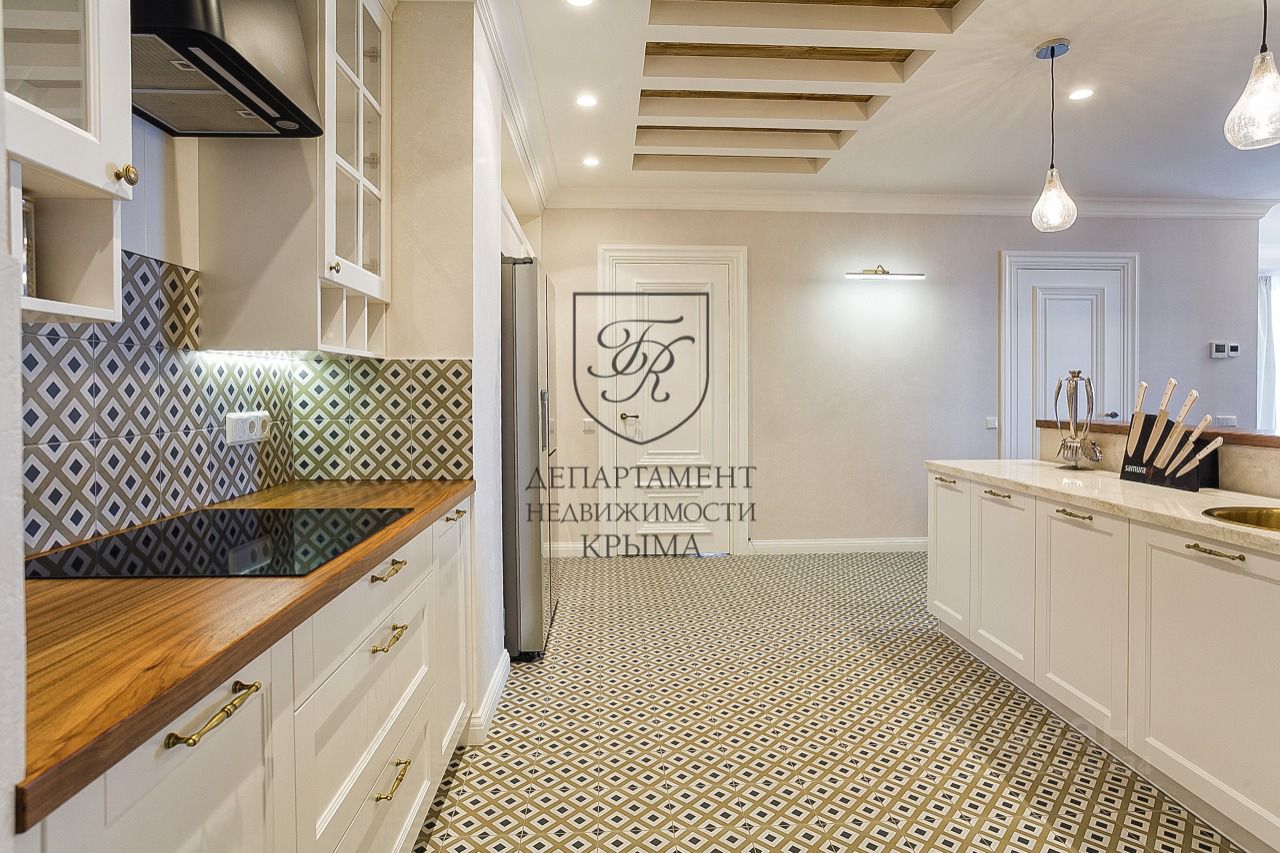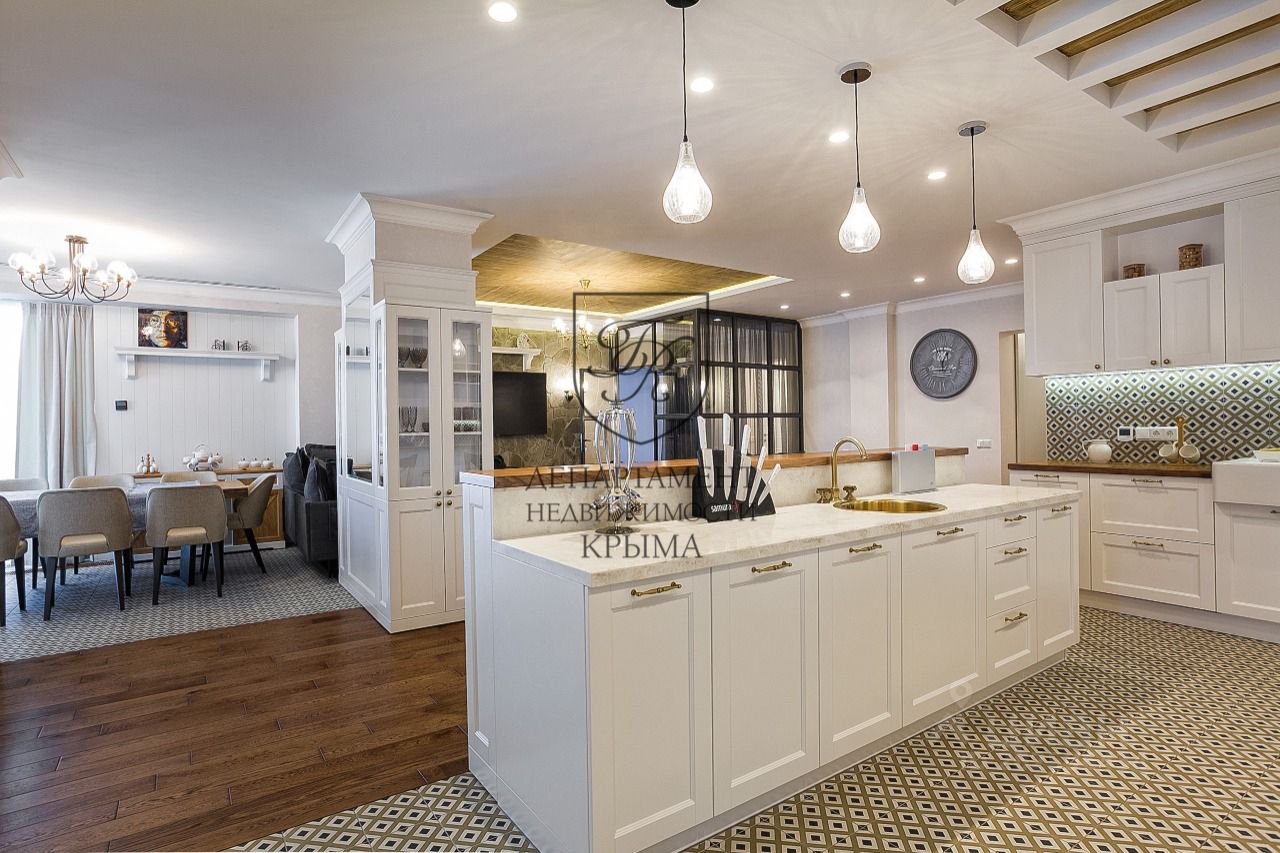 Кухня в квартире итальянского производства. На кухне установлен остров с большим количеством функциональных ящиков для хранения. Столешница острова выполнена из искусственного камня. Кухня полностью оборудована премиальной техникой бренда Miele: духовой шкаф, микроволновая печь, варочная поверхность, посудомоечная машина. Обеденная зона с потрясающим видом на море отделена от гостиной.