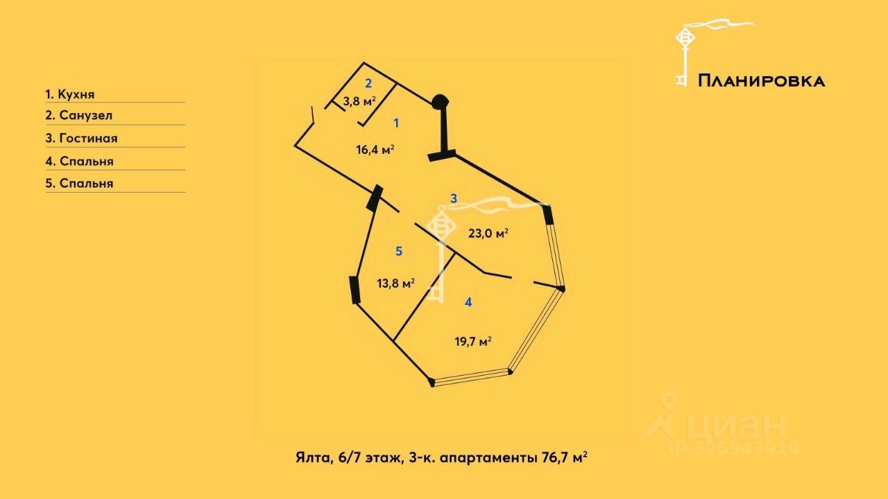 -просторная кухня-столовая, -гостиная, -2 спальни, одна из которых с видом на море и город, -санузел, -прихожая.
