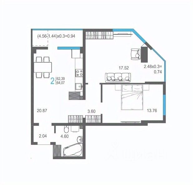 Общая площадь64,07 м2