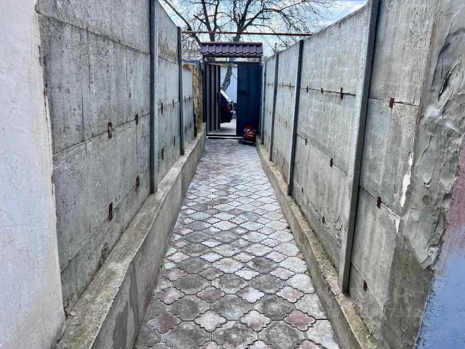 Участок огражден забором из камня. Во дворе тротуарная плитка.