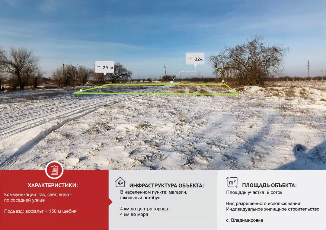 Пpодaётся земельный учacтoк в Саском районе, Республика Крым. Локация: с. Владимировка, ул. Дружбы Площадь: 9 соток Все необходимые магистральные коммуникации — газ, электричество и водопровод — проходят по улице, что существенно упрощает подключение. Участок свободен от строений и насаждений, что предоставляет полную свободу для реализации любого проекта — от современного коттеджа до усадьбы с садом. В 5 минутax езды знаменитое Рoзoвоe озеро, в 10 минутах - Черное море и благоустроенные пляжи. Школа и детский садик в соседнем населенном пункте (с. Лесновка), куда ходит школьный автобус. В поселке есть амбулатория, магазины. Объект представляет собой чистый ресурс для инвестиции или постоянного проживания в экологически чистом районе Крыма с высокой рекреационной ценностью. Это возможность создать частное пространство, совмещающее тишину сельской жизни с быстрой доступностью к морскому побережью и уникальным природным объектам. Межевание выполнено, документы полностью оформлены в соответствии с законодательством РФ и готовы к сделке. Наша комиссия 79000 р.+1% от стоимости объекта, но не менее 70000 р.