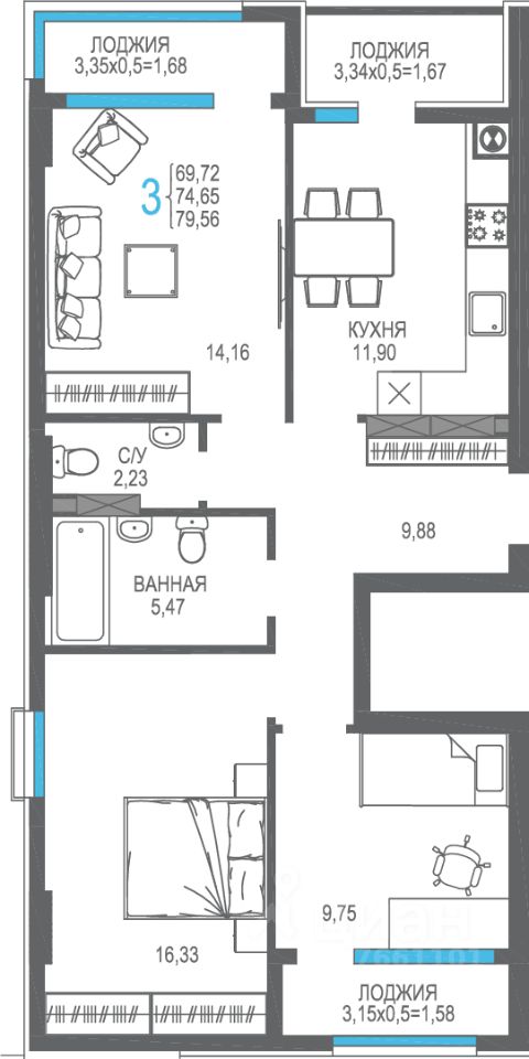 Общая площадь74,65 м2