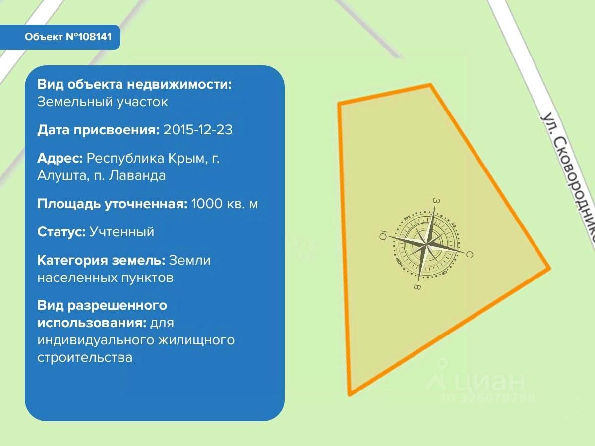 Площадь участка 10 соток. Назначение земельного участка: индивидуальное жилищное строительство.