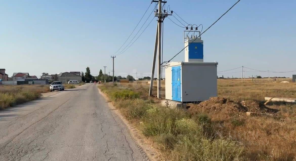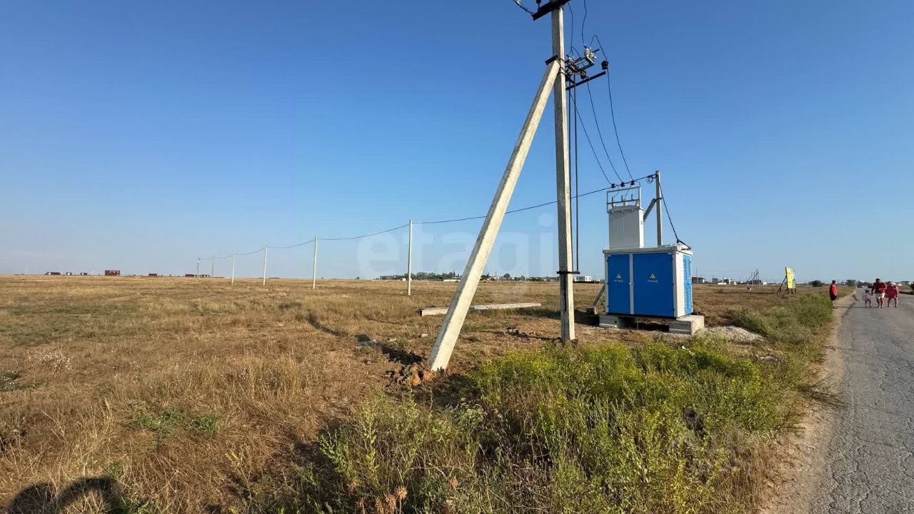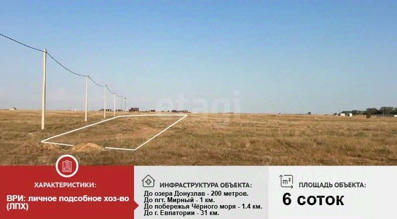 До г. Евпатория - 31 км, участок расположен рядом с пгт. Мирный (1 км), до побережья Чёрного моря - 1.4 км, до озера Донузлав - всего 200 м. На участке уже есть доступ к электричеству.