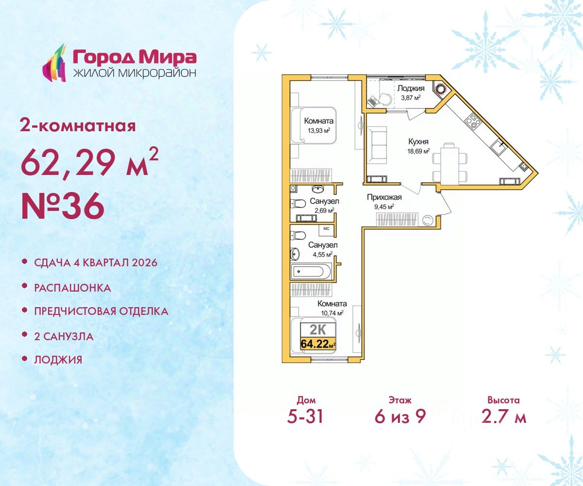 Продается двухкомнатная квартира с предчистовой отделкой в ЖМ ''Город Мира'' на 6 этаже. Общая площадь: 62.29 кв.м., жилая: 24.67 кв.м., площадь просторной кухни-столовой: 18.69 кв.м. Квартира - распашонка, без проходных комнат, окна выходят на paзные стороны дома. В квартире одна лоджия, один совмещенный и один раздельный санузел. Высота потолков 2.7 м.