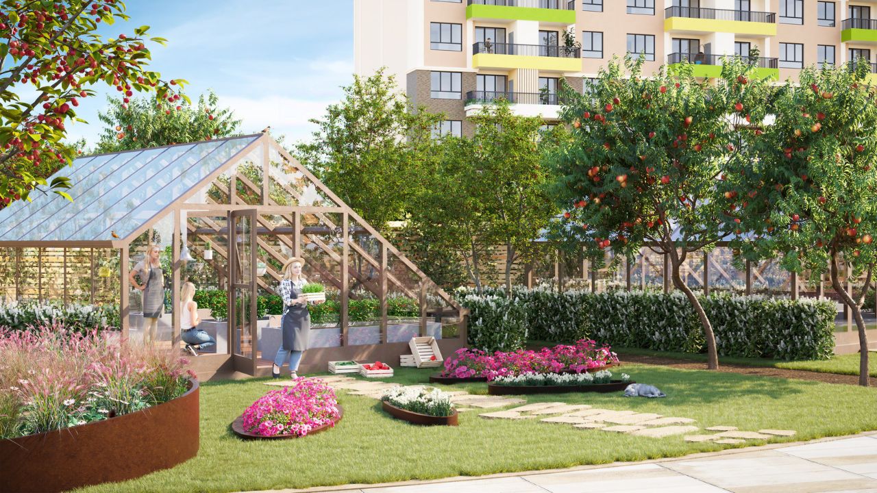 Много зелени, цветов и фруктов Буйство цвета южной флоры в озеленении квартала поражает воображение! Деревья с сочными фруктами и яркие цветы с тонким ароматом подарят вам ощущение счастья и бесконечного лета.