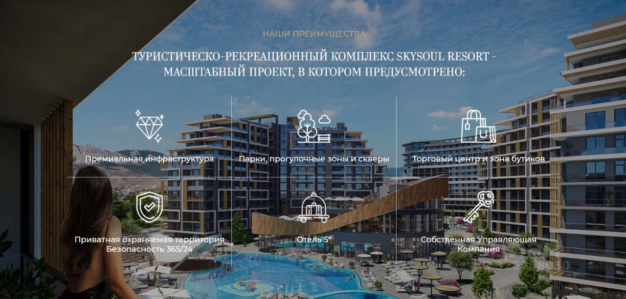 ''SkySoul Resort'' — это 14,5 гектаров закрытой территории всего в 30 метрах от моря. Это комплекс Бизнес-класса спроектированный по концепции ''город в городе'' где все необходимое для жизни находиться в в шаговой доступности. Комплекс предлагает разнообразие планировочных решений площадью от 27 до 110 м². Проект состоит из 9 корпусов различной этажности с 2 500 единицами номерного фонда, 80% которого имеют панорамный вид на море.