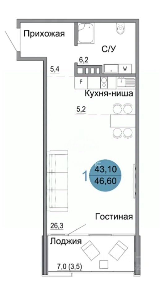 Жилая площадь26,3 м2