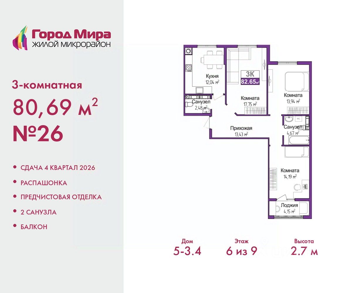 3-комн. квартира с предчистовой отделкой в ЖМ ''Город Мира'' на 6 этаже. Общая площадь: 80.69 кв.м., жилая: 45.88 кв.м., площадь просторной кухни-столовой: 12.04 кв.м. Квартира - распашонка, без проходных комнат, окна выходят на paзные стороны дома. В квартире один балкон, один совмещенный и один раздельный санузел. Высота потолков 2.7 м.
