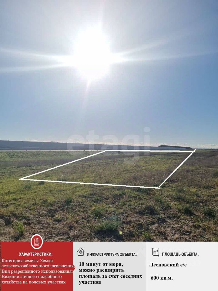 Земельный участок площадью 6 соток расположен в Лесновский с/с Сакского района Можно приобрести 12 участков по 6 соток Вид разрешенного использования - Ведение личного подсобного хозяйства на полевых участках