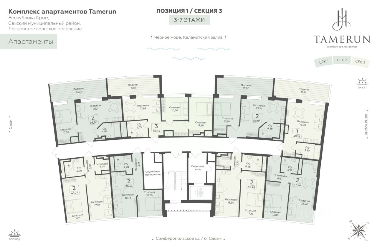Продаются 2-комнатные апартаменты в строящемся доме (Этап 1 (Секции 1-3)), срок сдачи: IV-кв. 2028, общей площадью 47.54 кв.м., на 6 этаже. ''Tamerun'' - морская резиденция на Западном берегу Крыма, между городами Евпатория и Саки.