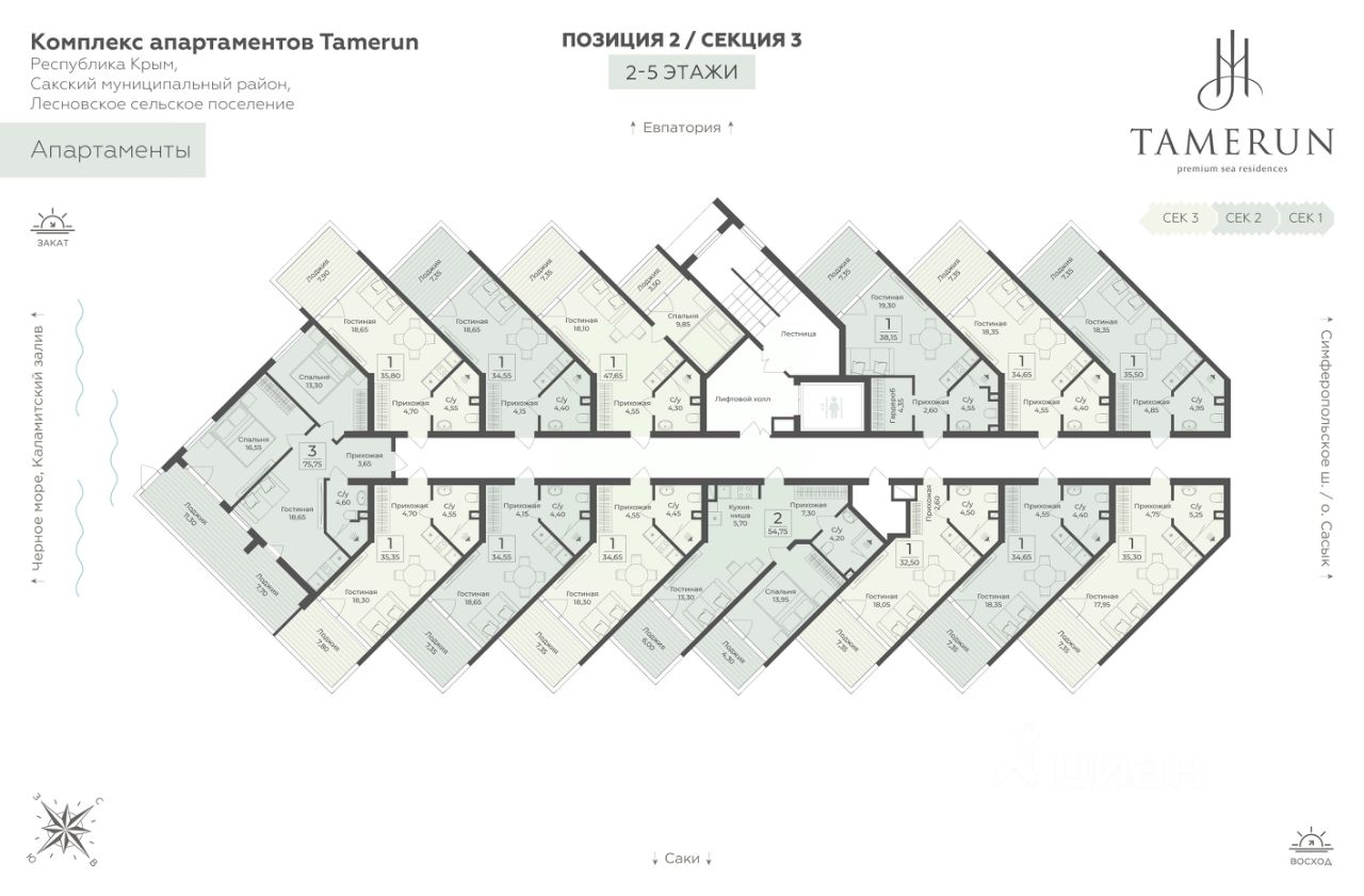 Продаётся студия-апартаменты в строящемся доме (Этап 2 (Секции 1-3)), срок сдачи: II-кв. 2029, общей площадью 38.15 кв.м., на 2 этаже. ''Tamerun'' - морская резиденция на Западном берегу Крыма, между городами Евпатория и Саки.