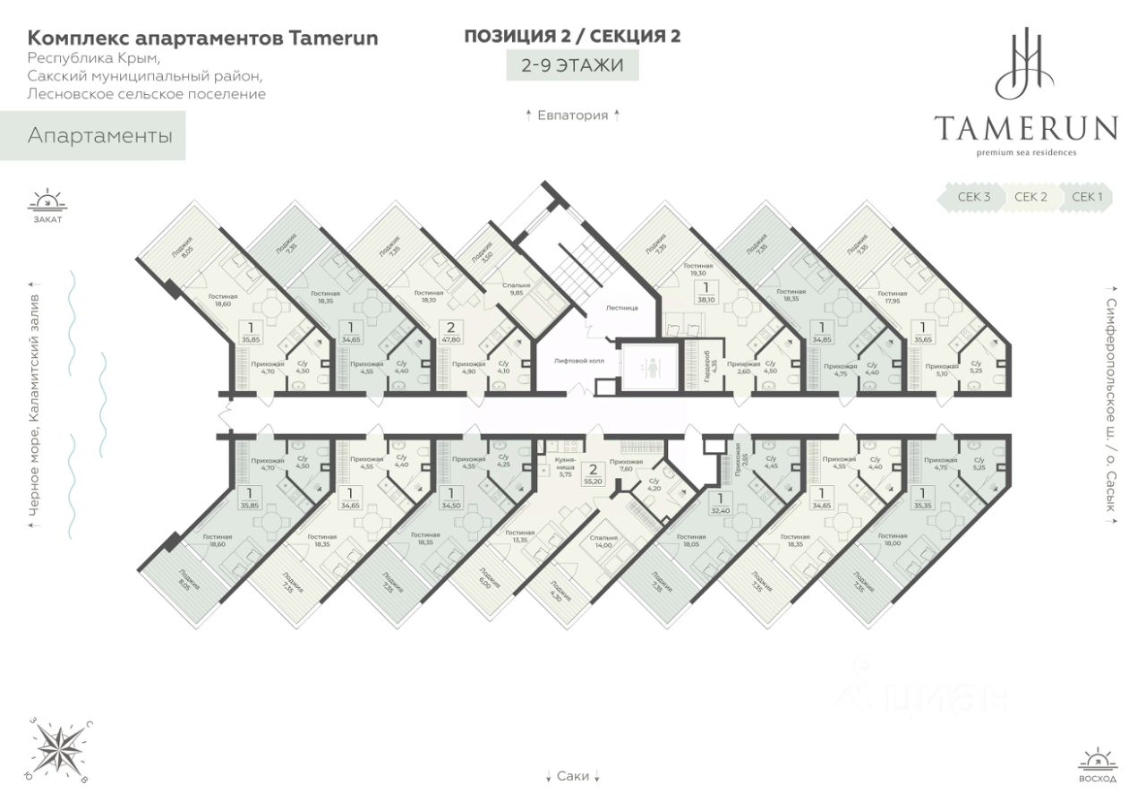 Продаются 2-комнатные апартаменты в строящемся доме (Этап 2 (Секции 1-3)), срок сдачи: II-кв. 2029, общей площадью 55.2 кв.м., на 4 этаже. ''Tamerun'' - морская резиденция на Западном берегу Крыма, между городами Евпатория и Саки.