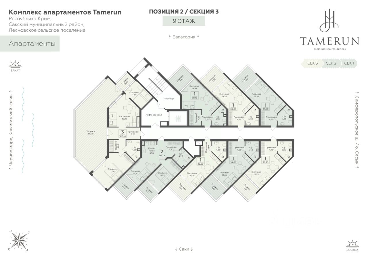 Продаются 3-комнатные апартаменты в строящемся доме (Этап 2 (Секции 1-3)), срок сдачи: II-кв. 2029, общей площадью 123.45 кв.м., на 9 этаже. ''Tamerun'' - морская резиденция на Западном берегу Крыма, между городами Евпатория и Саки.