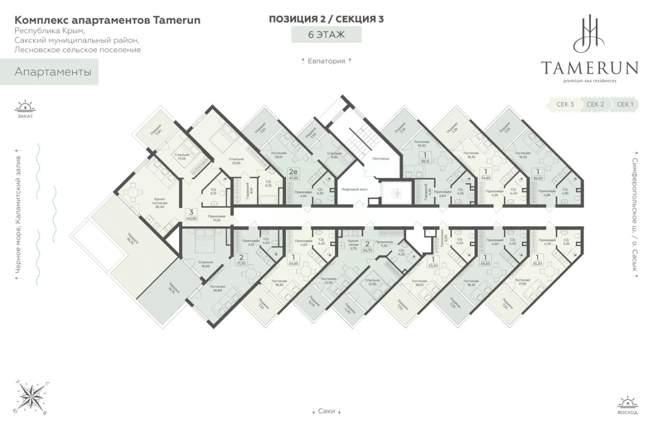 Продаются 2-комнатные апартаменты в строящемся доме (Этап 2 (Секции 1-3)), срок сдачи: II-кв. 2029, общей площадью 47.65 кв.м., на 6 этаже. ''Tamerun'' - морская резиденция на Западном берегу Крыма, между городами Евпатория и Саки.