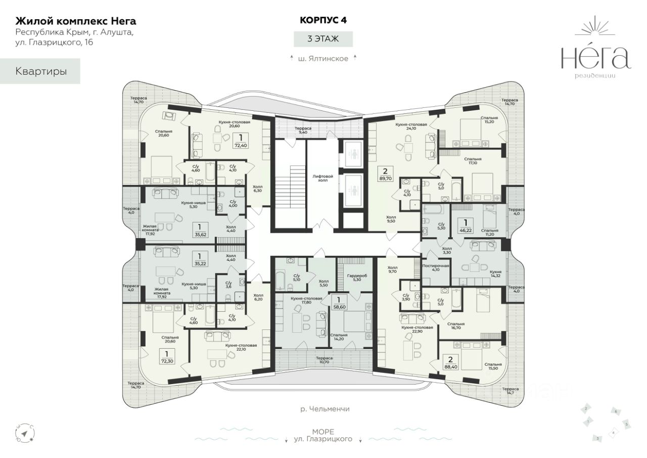 Продаётся 2-комнатная квартира в строящемся доме (Корпус 4), срок сдачи: III-кв. 2028, общей площадью 72.3 кв.м., на 3 этаже. Премиальный жилой комплекс ''Нега'' возводится в Профессорском уголке неподалёку от набережной, где снимался фильм ''Кавказская пленница''.