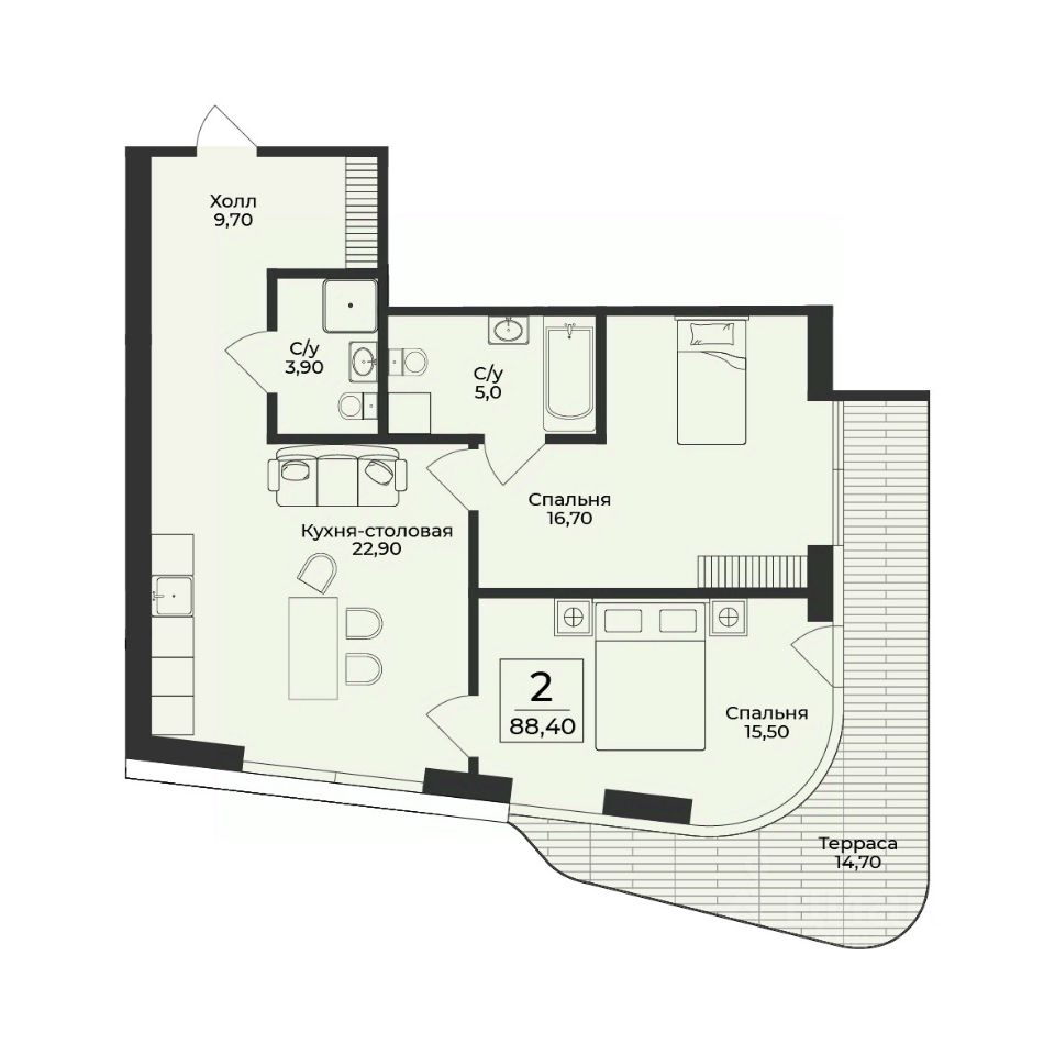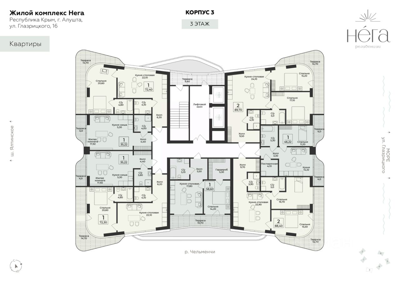 Продаётся 2-комнатная квартира в строящемся доме (Корпус 3), срок сдачи: III-кв. 2028, общей площадью 88.4 кв.м., на 3 этаже. Премиальный жилой комплекс ''Нега'' возводится в Профессорском уголке неподалёку от набережной, где снимался фильм ''Кавказская пленница''.