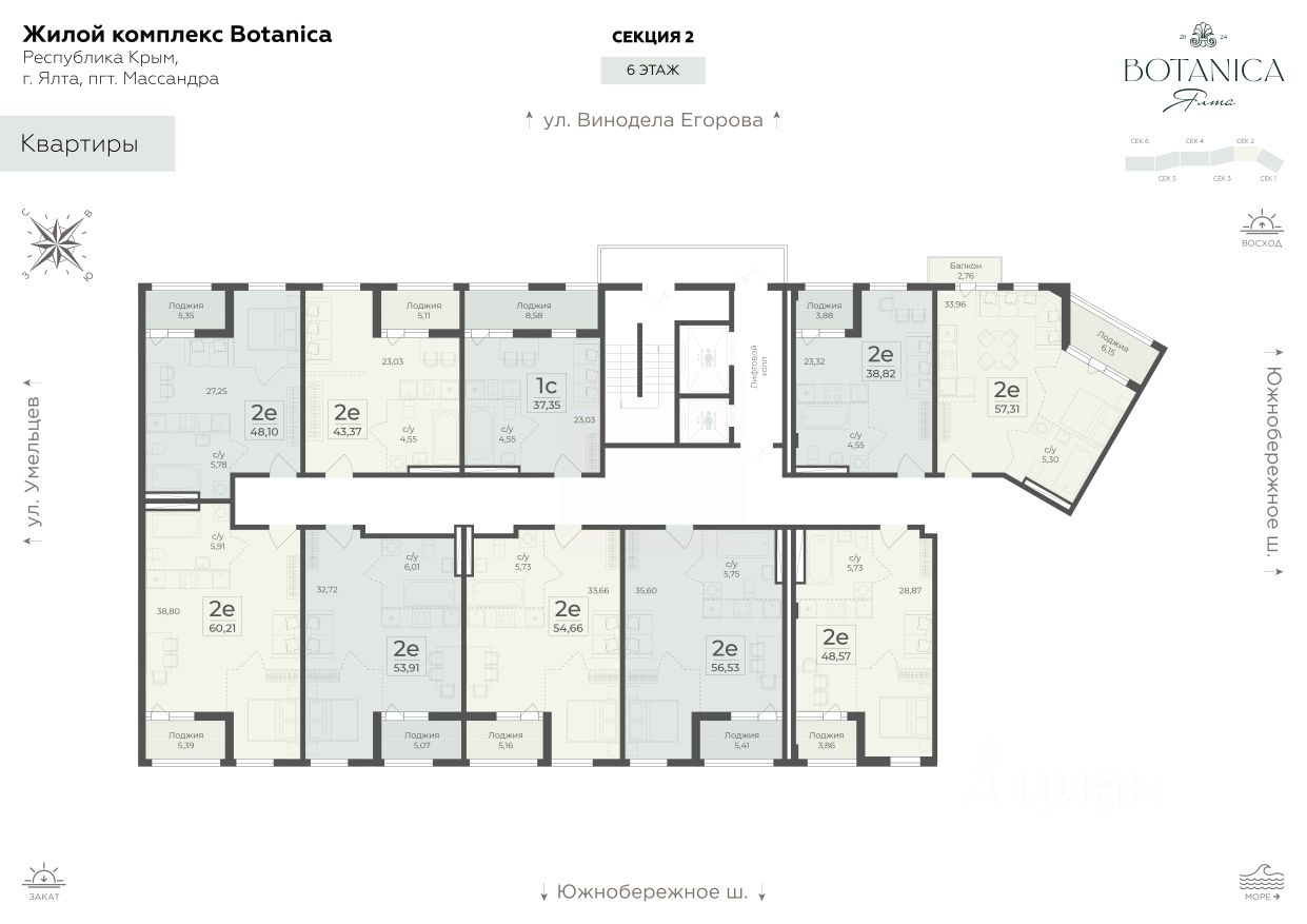Продаётся 2-комнатная квартира в строящемся доме (Корпус 1 (секция 1, 2)), срок сдачи: I-кв. 2029, общей площадью 48.1 кв.м., на 6 этаже. Новый жилой комплекс ''Botanica'' от застройщика ''Развитие'' расположен по адресу Россия, Республика Крым, городской округ Ялта, посёлок городского типа Массандра, Южнобережное шоссе