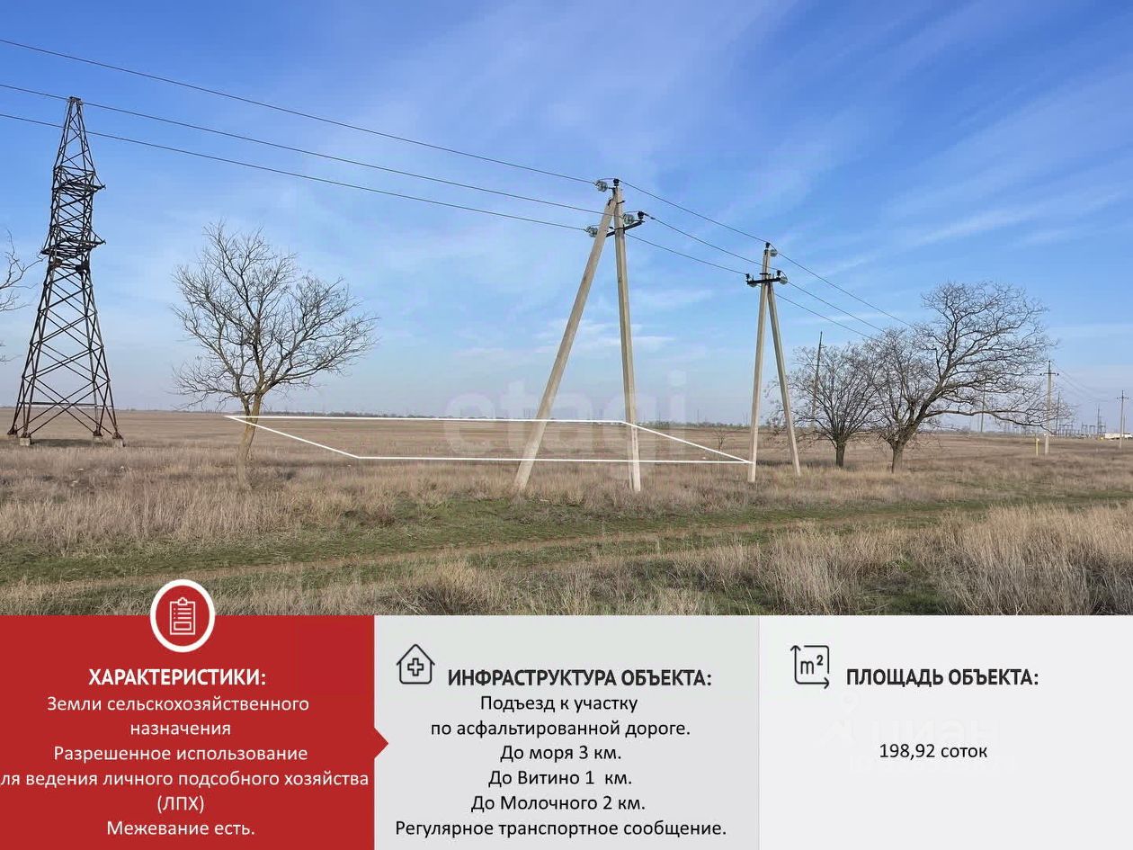 Продается участок 198,92 соток ( 1,99га.) ЛПХ в Молочненское сельское поселение, Сакский район, Республика Крым рядом с Евпаторией, на территории Молочненского сельского совета.