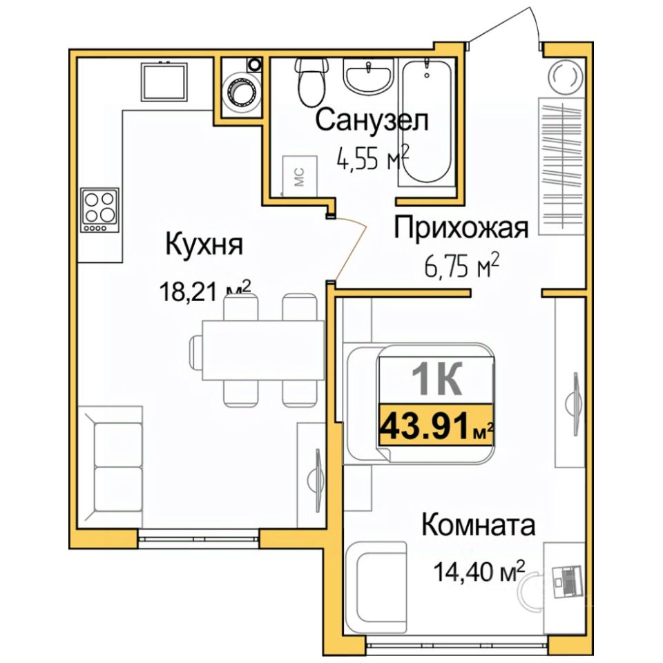 1-комн. квартира от застройщика с предчистовой отделкой в ЖМ ''Город Мира'' на 1 этаже. Общая площадь: 43.91 кв.м. Высота потолков 2.7 м.