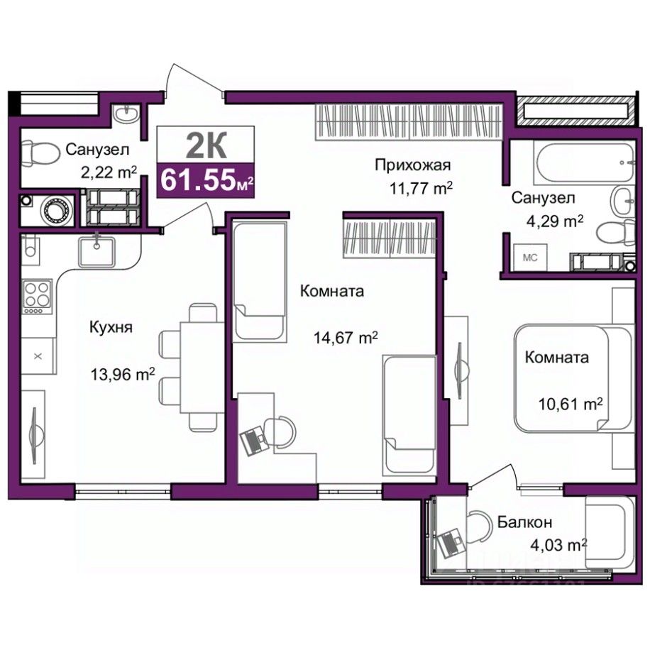 Общая площадь57,6 м2