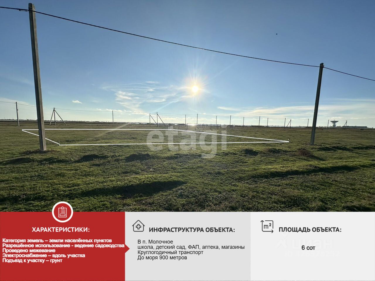 В п. Молочное есть вся инфраструктура: школа, детский сад, магазины, ФАП, аптеки, круглогодичный транспорт. Море и пляж в 900 метрах от участка.