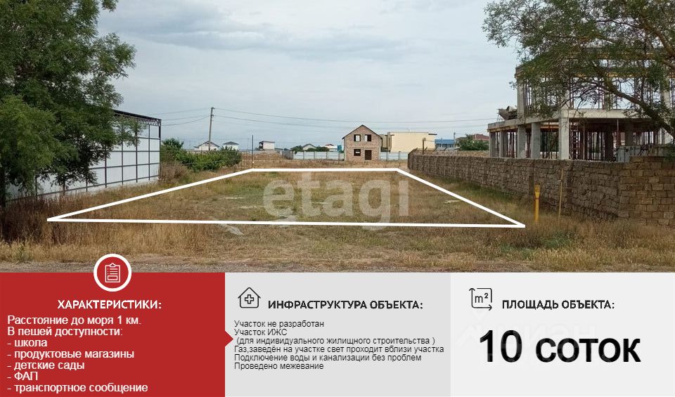 Земельный участок площадью 10 соток расположен в курортном поселке Молочное под Евпаторией.