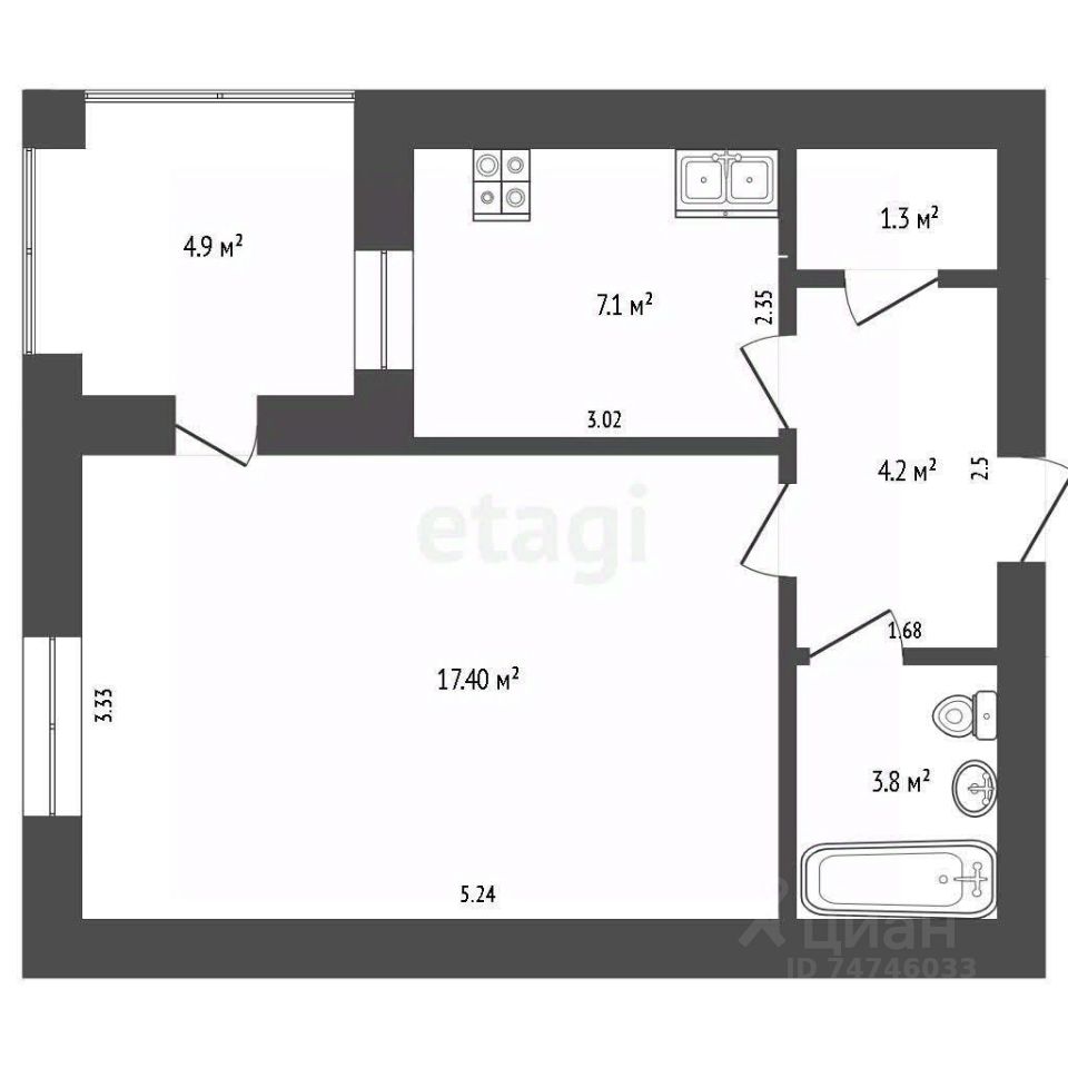Планировка практичная: изолированная комната и просторная кухня в 7,1 кв. м. Окна выходят во двор на солнечную сторону, обеспечивая тишину и обилие естественного света.