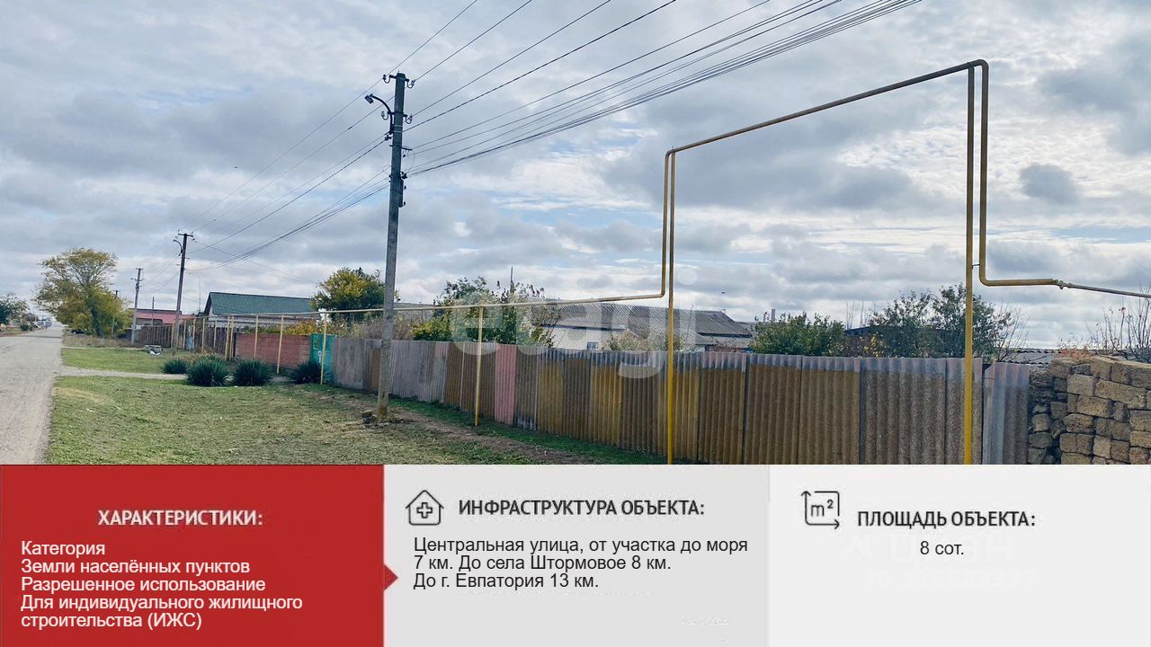 Центральная улица, от участка до моря 7 км. До села Штормовое 8 км. До г. Евпатория 13 км. В селе Абрикосовка есть своя Амбулатория и магазины, постоянно ходит общественный транспорт, рядом проходит трасса Евпатория-Мирный.