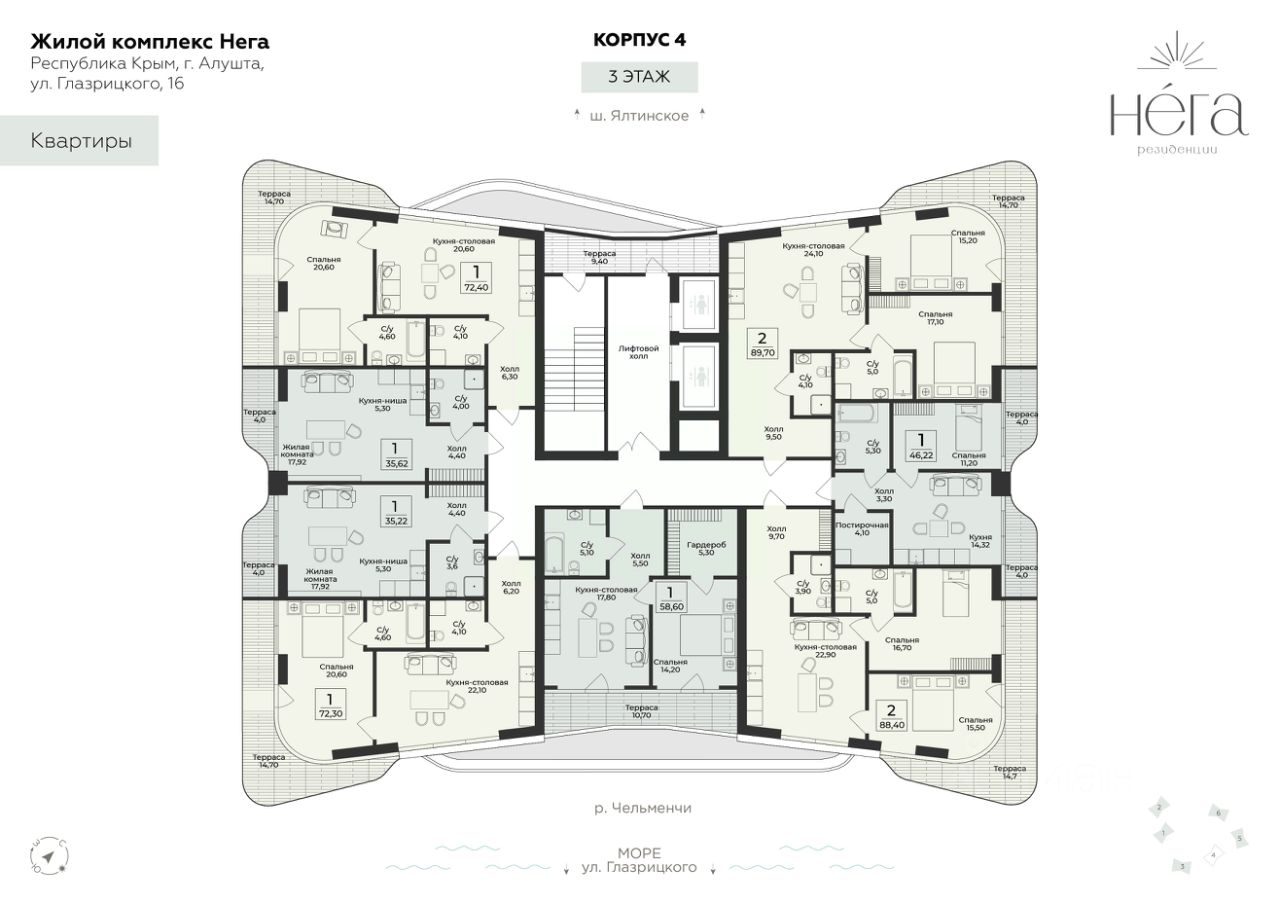 Продаётся 2-комнатная квартира в строящемся доме (Корпус 4), срок сдачи: III-кв. 2028, общей площадью 89.7 кв.м., на 3 этаже. Премиальный жилой комплекс ''Нега'' возводится в Профессорском уголке неподалёку от набережной, где снимался фильм ''Кавказская пленница''.