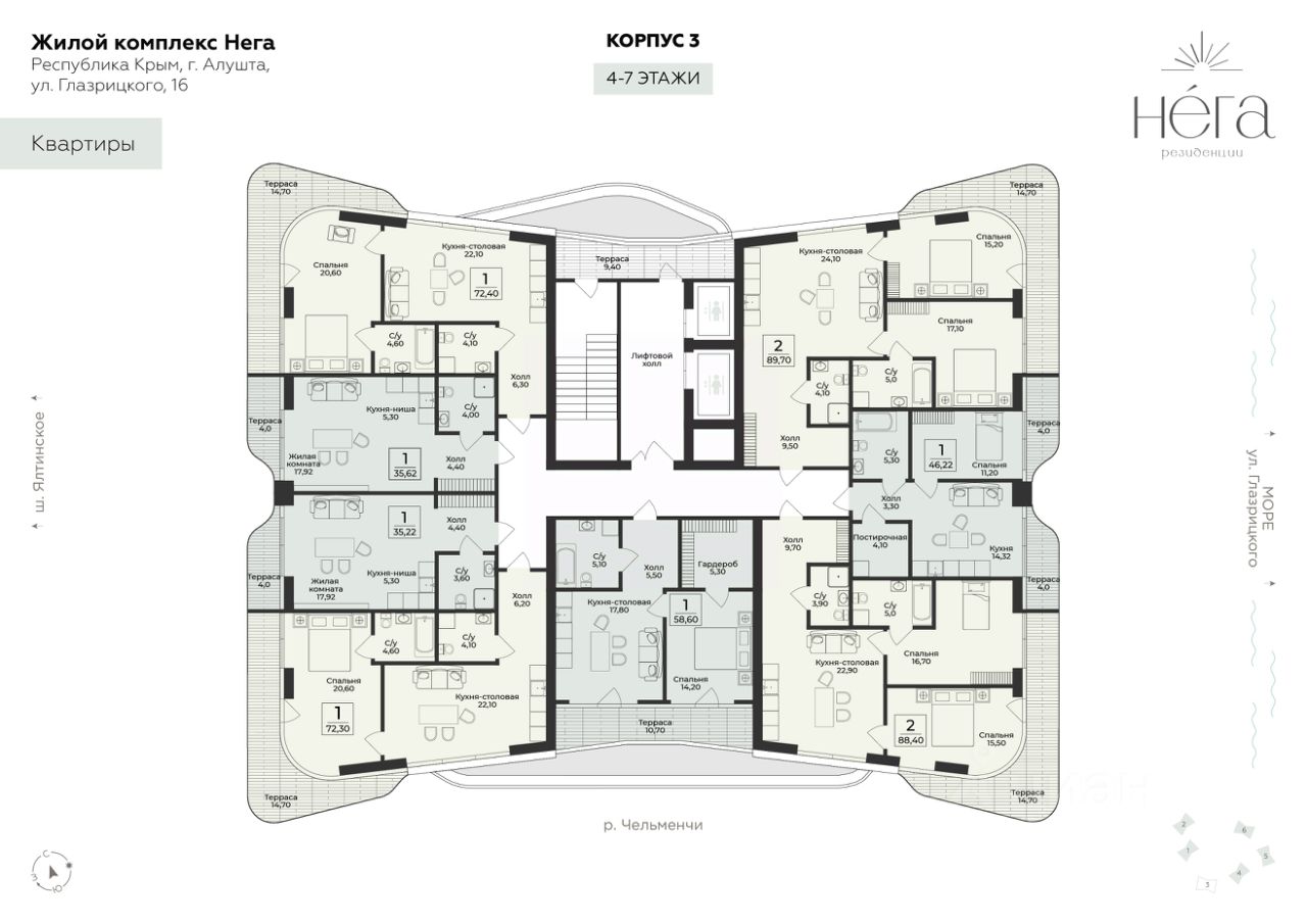 Продаётся 2-комнатная квартира в строящемся доме (Корпус 3), срок сдачи: III-кв. 2028, общей площадью 88.4 кв.м., на 5 этаже. Премиальный жилой комплекс ''Нега'' возводится в Профессорском уголке неподалёку от набережной, где снимался фильм ''Кавказская пленница''.