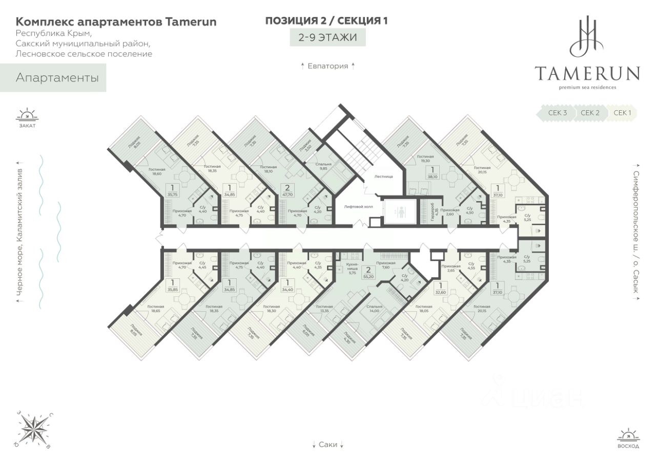 Продаётся студия-апартаменты в строящемся доме (Этап 2 (Секции 1-3)), срок сдачи: II-кв. 2029, общей площадью 37.1 кв.м., на 9 этаже. ''Tamerun'' - морская резиденция на Западном берегу Крыма, между городами Евпатория и Саки.