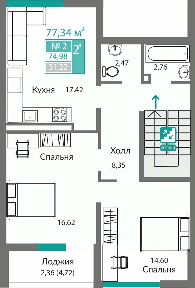 Продаётся 2-комнатная квартира в строящемся доме (9 этап (Секция Б9.2)), срок сдачи: I-кв. 2027, общей площадью 74.98 кв.м., на 2 этаже. ОТКРЫВАЕМ НОВЫЕ ГОРИЗОНТЫ