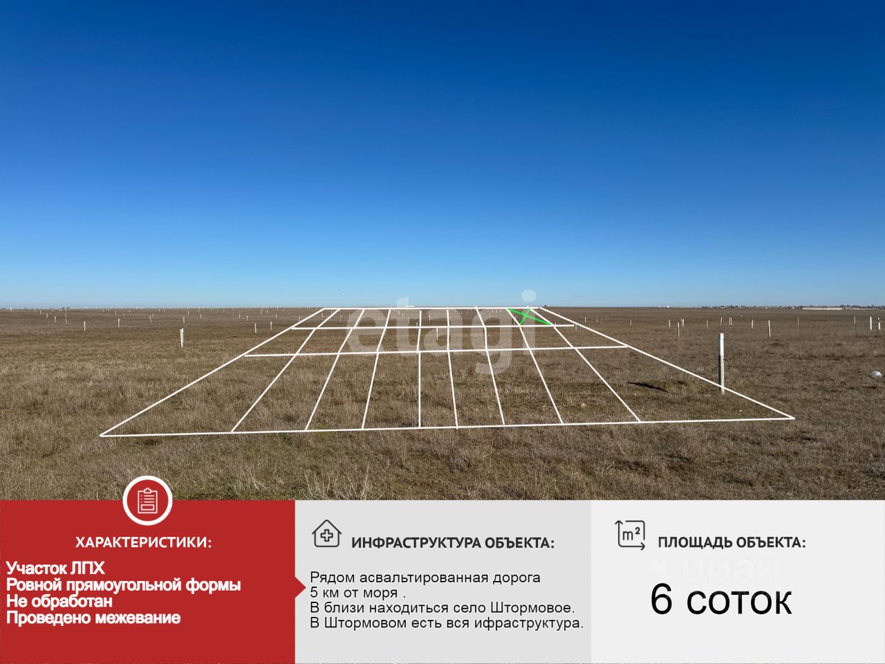 Участок площадью 6,08 соток расположен вблизи села Штормовое. Земля сельскохозяйственного назначения с разрешенным использованием для ведения личного подсобного хозяйства на полевых участках предоставляет возможности для организации сада, огорода или загородной усадьбы. Участок отличается ровным рельефом и правильной геометрической формой, что упрощает планирование и освоение территории. Ключевым преимуществом является удачное расположение: всего 5 км отделяют участок от морского побережья, а до озера — около 4 км. Вся необходимая повседневная инфраструктура доступна в селе Штормовое, где находятся магазины, аптеки, детские сады и школы, что обеспечивает баланс между загородным спокойствием и доступностью социальных объектов. Участок представляет собой готовую основу для реализации проектов загородной жизни с перспективой развития и высокой транспортной доступностью к природным и социальным объектам.