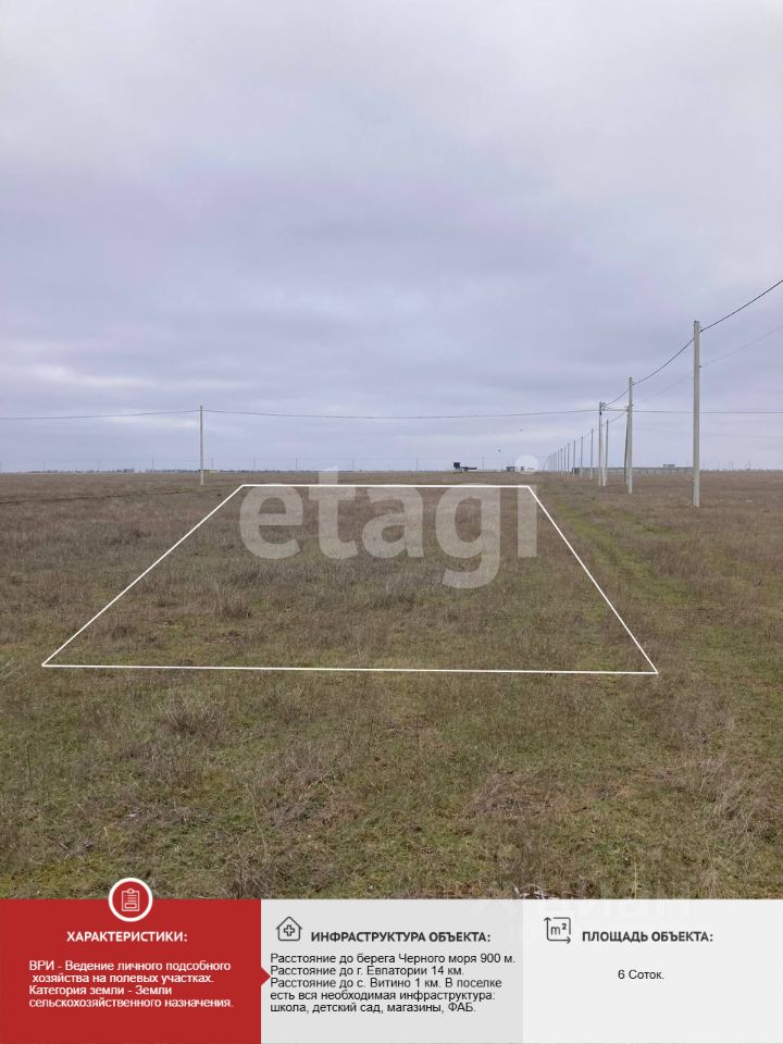 Участок ровный прямоугольной формы, не огорожен. Электричество проходит вдоль участка. Расположен в 1 км от с. Витино Сакского района, в котором есть вся необходимая инфраструктура: аптеки, ФАП, магазины и рынок.