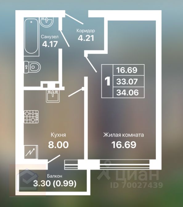 Общая площадь: 34,06 м² Этаж: 5/9 Современная планировка. Горячая и холодная вода, подключение к электричеству. Лифт. Преимущества: