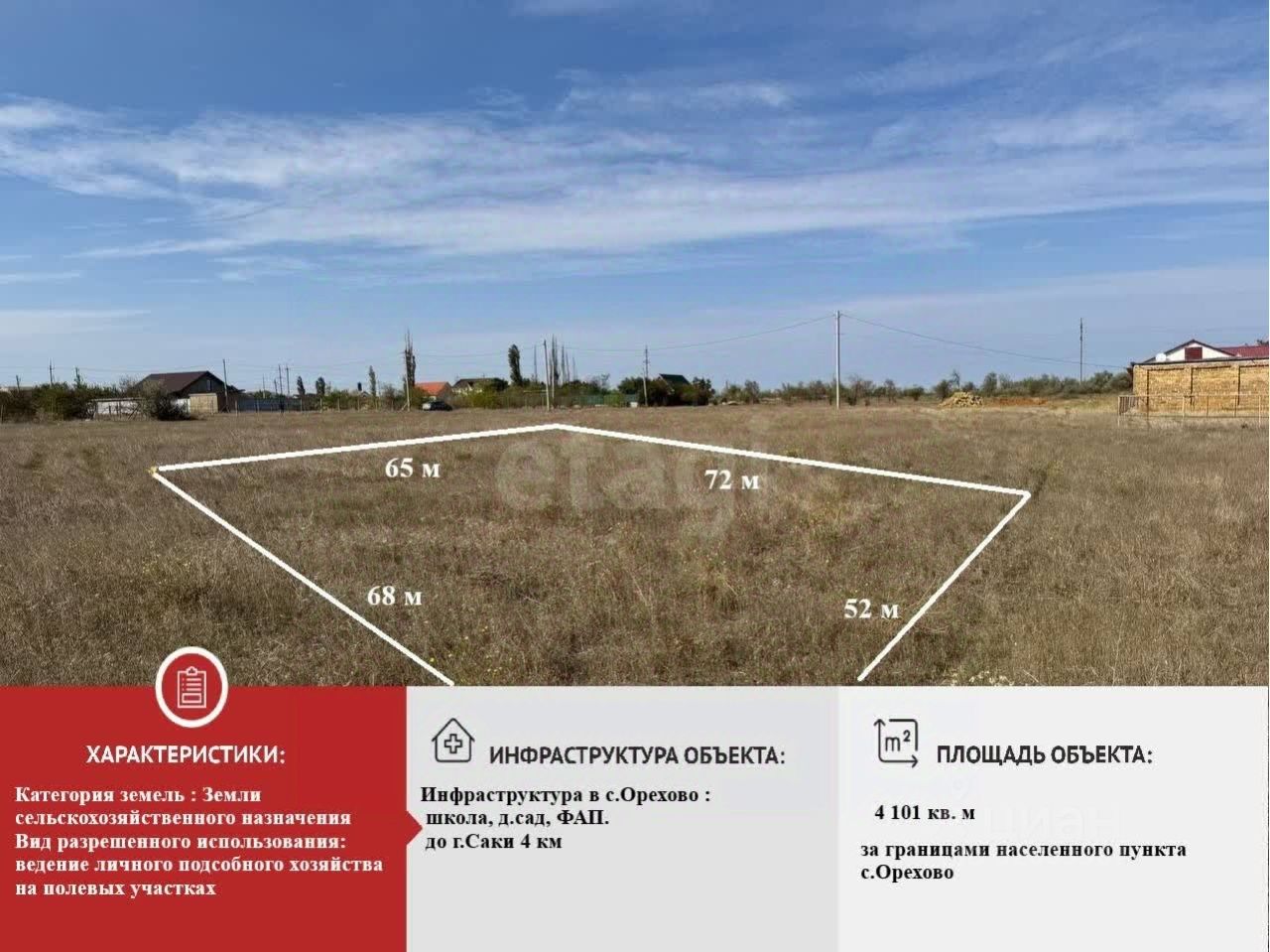 Центр посёлка, с хорошо развитой инфраструктурой находится в 1.2 км, город Саки — 4 км, море с благоустроенным песчаным пляжем в 7 км от участка. Регулярное автобусное сообщение с городами Симферополь, Саки, Евпатория, пгт Новофёдоровка, маршрутки ходят каждые 20 минут. Документы готовы к продаже ,звоните отвечу на все вопросы. Наша комиссия 79000 р.+1% от стоимости объекта, но не менее 70000 р.