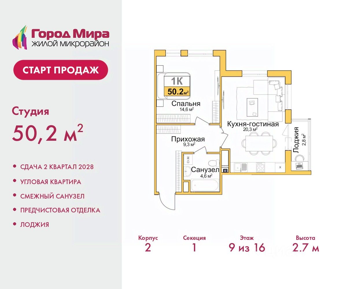 Продается 2-комн. квартира с европланировкой и предчистовой отделкой в ЖМ ''Город Мира'' на 9 этаже. Общая площадь: 50.2 кв.м., жилая: 24.9 кв.м., общая площадь гостиной-столовой с кухонной зоной: 20.3 кв.м. Европланировка, в просторной кухне-гостиной удобно как готовить, так и отдыхать. Квартира угловая, окна oбecпeчивaют paвнoмepнoe ocвeщeниe в тeчeниe дня. В квартире одна лоджия, один совмещенный санузел. Высота потолков 2.7 м.