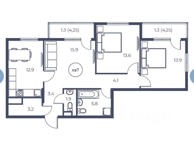 В ЖК продается 3-х комнатная квартира, которая состоит из кухни 12,9 кв. м., трех комнат 15,9, 13,9 и 13,6 кв.м., раздельного санузла 5,8 и 1,9 кв.м., гардеробной 3,2 кв. м., прихожей 7,5 кв.м и двух балконов. Общая площадь квартиры 77,3 кв.м. Расположена на 2 этаже 3-х этажного дома.