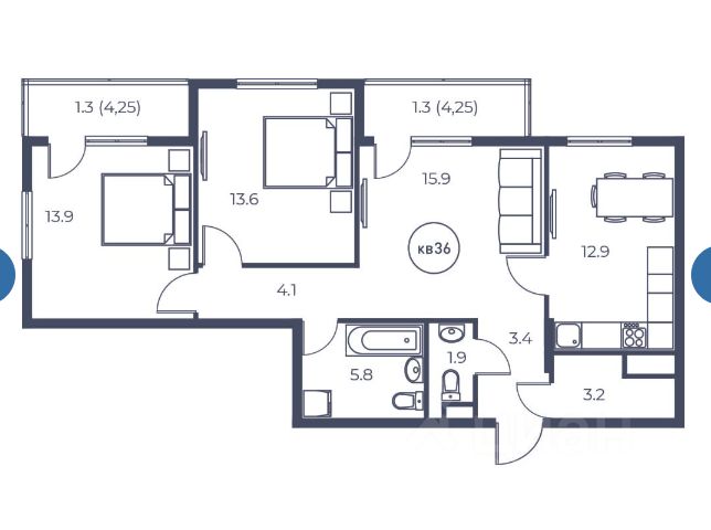 В ЖК продается 3-х комнатная квартира, которая состоит из кухни 12,9 кв. м., трех комнат 15,9, 13,9 и 13,6 кв.м., раздельного санузла 5,8 и 1,9 кв.м., гардеробной 3,2 кв. м., прихожей 7,5 кв.м и двух балконов. Общая площадь квартиры 77,3 кв.м. Расположена на 3 этаже 3-х этажного дома.
