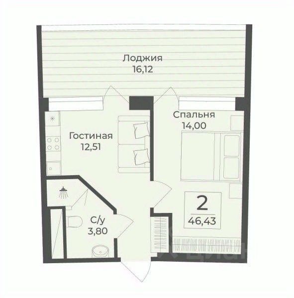 В строящемся апарт-комплексе TAMERUN продаются апартаменты, которые состоят из кухни-гостиной 12,5 кв.м, спальни 14,0 кв.м, санузла 3,8 кв.м и лоджия 16,1 кв.м. Общая площадь 46,4 кв.м.