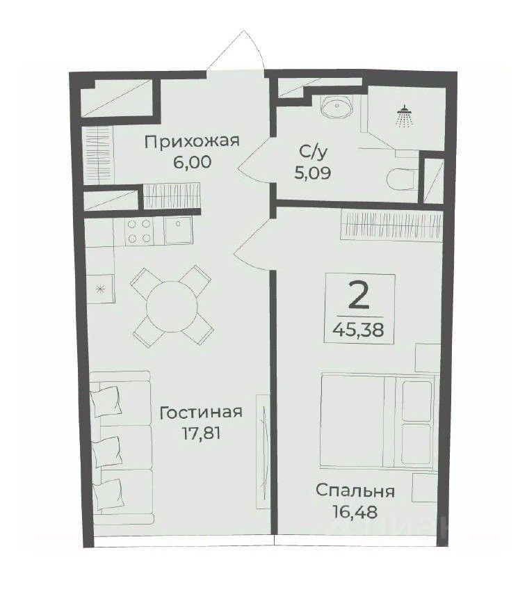 В строящемся апарт-комплексе TAMERUN продаются апартаменты, которые состоят из кухни-гостиной 17,8 м2, спальни 16,5 м2, санузла 5,1 м2 и прихожей 6,0 м2. Общая площадь 45,4 м2.