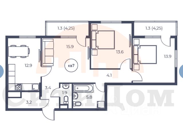 В ЖК продается 3-х комнатная квартира, которая состоит из кухни 12,9 кв. м., трех комнат 15,9, 13,9 и 13,6 кв.м., раздельного санузла 5,8 и 1,9 кв.м., гардеробной 3,2 кв. м., прихожей 7,5 кв.м и двух балконов. Общая площадь квартиры 77,3 кв.м. Расположена на 2 этаже 3-х этажного дома.