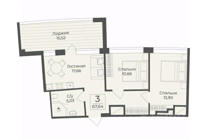 В строящемся апарт-комплексе TAMERUN продаются апартаменты, которые состоят из кухни-гостиной 17,7 кв.м, двух спален 13,9 и 10,7 кв.м, санузла 5,0 кв.м, коридора 4,8 кв.м и лоджии 15,5 кв.м. Общая площадь 67,6 кв.м.